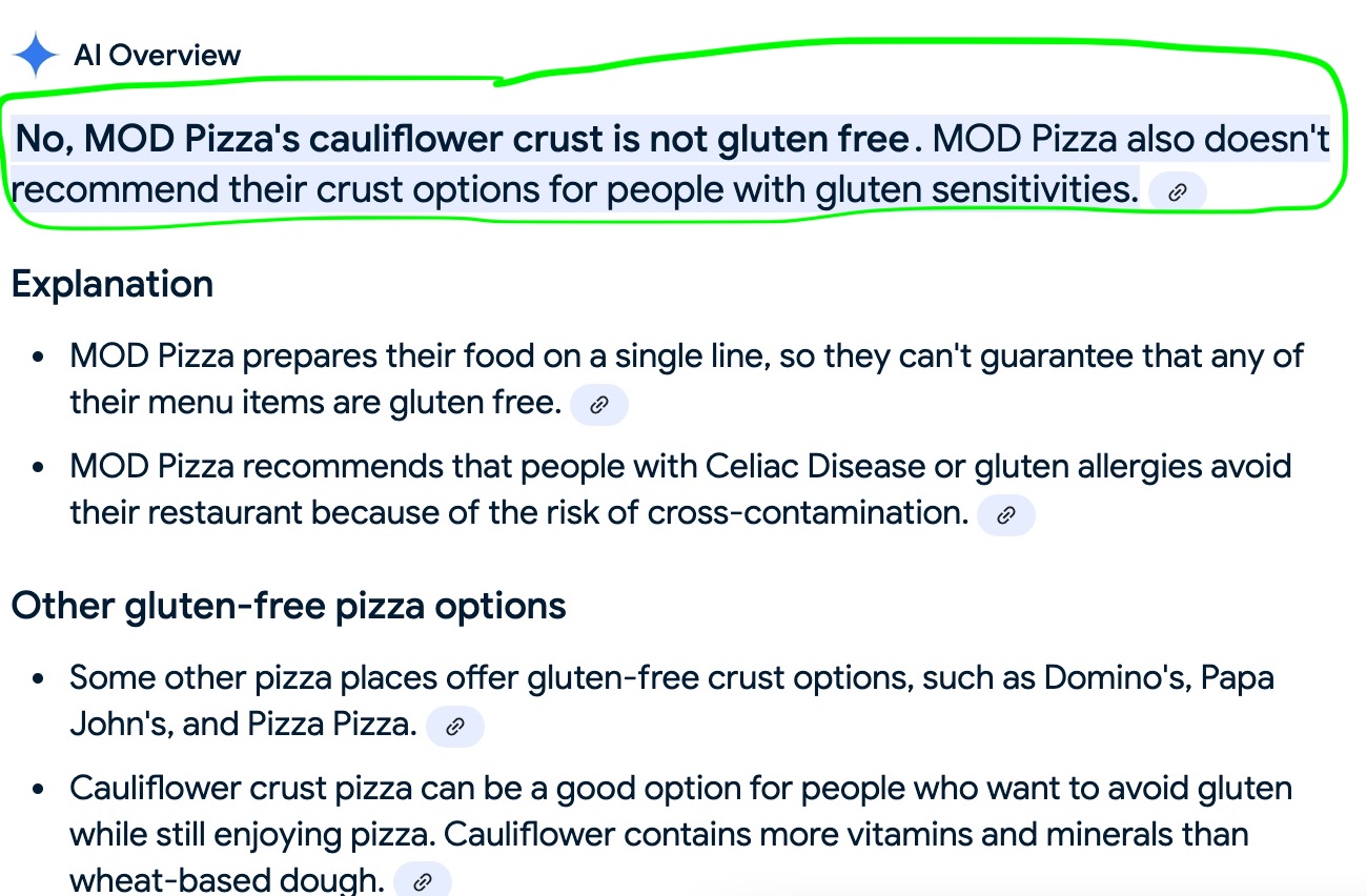 In this relatively innocuous example, its “AI” claims Mod Pizza’s cauliflower crust is not gluten free — and goes so far as to assert on Mod’s behalf that Mod doesn’t recommend its own crust options for gluten-sensitive people. It goes even further to say “Mod Pizza recommends that people with Celiac Disease or gluten allergies avoid their restaurant.”